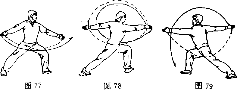 ③右脚外展,左脚内扣,上体随之右转成右弓步;在身体转 动的同时,右臂向上、向右、向下,向体后直臂弧形摆动,虎口 朝下,左臂向下、向左、向上、向身前直臂弧形摆动,虎口朝上 (图 79)。