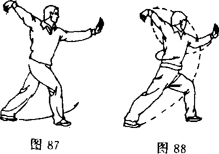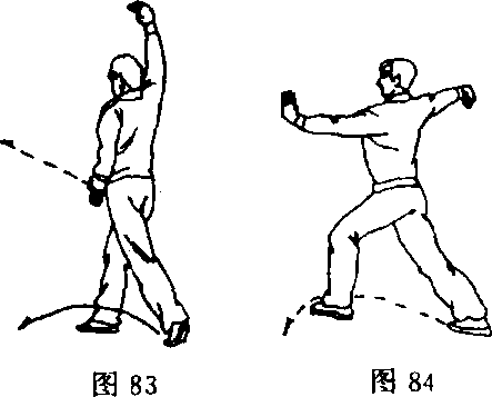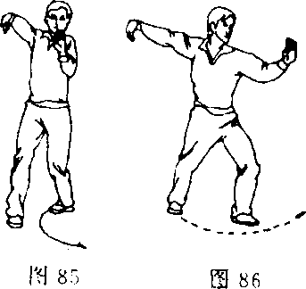 ③上肢不动,右脚向左前方上步,脚尖内扣(图85)。