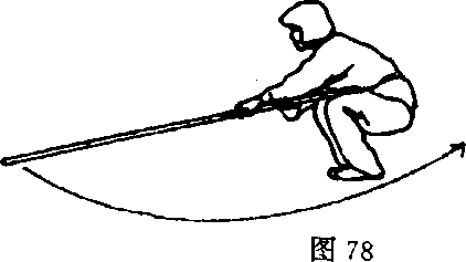 ⑤右脚内扣,左脚后跟 落地向左碾转,身体左转 270度,边转重心边下移成 下蹲并步;同时,两手握棍 由棍梢一端继续沿身体外 侧抡扫一周向体前下方拨 棍;目随棍行(图78)。