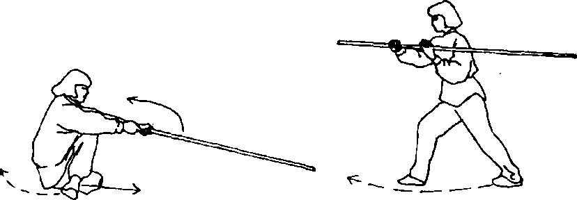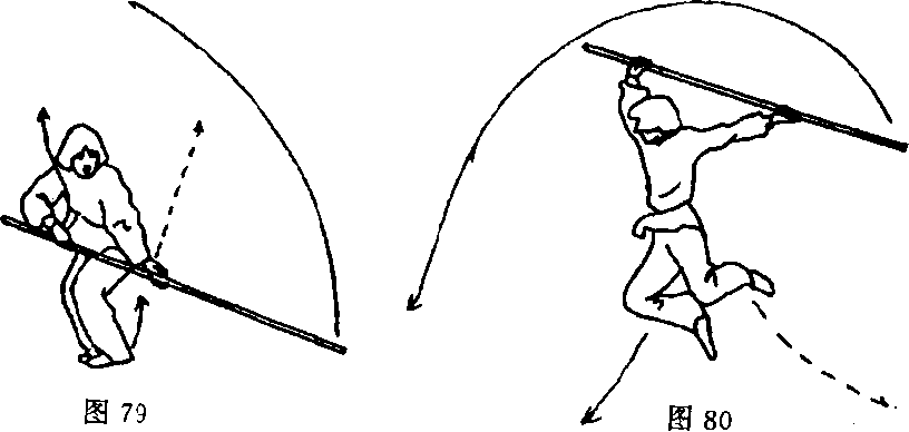 ①身体向左转,由下向上立起,准备起跳;同时,棍向身体左侧 下方扫棍时左手活把拉棍;目视棍梢(图79)。