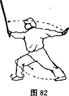 ①上身立起,下肢 右弓步略高;右手握棍 把直臂端举放在面前, 左臂伸直立按掌;目视 棍前方(图82)。