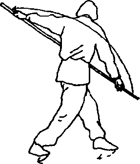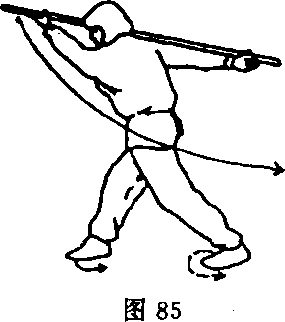 ④左脚掌碾转内扣,身体 继续右转180度,朝45度方向 右脚拧转朝前;随转身右手握 棍把端向身体右后斜下方拉 棍,右臂直臂,右手虎口托棍 把,左手掌心向上,托住棍梢, 棍身绕在脖子右侧右肩上方, 上体微向左倾;目视左下方(图 85)0
