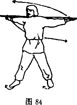 图83③右脚掌向外碾转,右脚掌内扣,两腿直立,两脚尖朝前,身体 右翻180度;同时,右手握棍,随棍把端分腿右转向上,两臂伸直, 右手托棍梢,左手虎口托棍把,棍在头上方时,速落于肩部,整个棍 横摆于肩胛骨上方,身体微后仰;目视前方(图84) o
