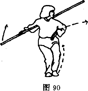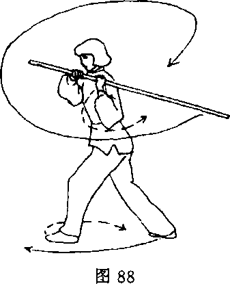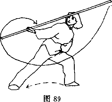身在头上方,立绕一周,左手成掌自然落于左胯外侧;目视棍右斜 前方(图89)。 '