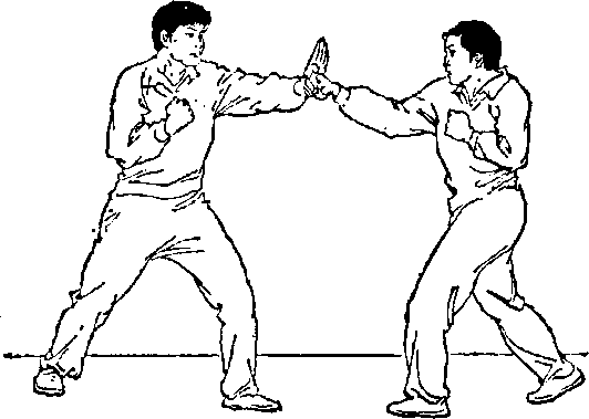 当对方想以拳进攻我上盘时我可用手阻截之。即对方以右直拳进攻时在其发力之前我用左掌迅速迎击其右拳阻截对方进攻(图一51)要求判断准确出击及时。