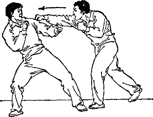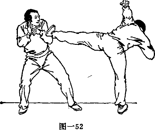 起用膝部阻截其左脚(图一53)。要求判断准确屈膝、抬腿、阻截应连贯一致。