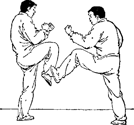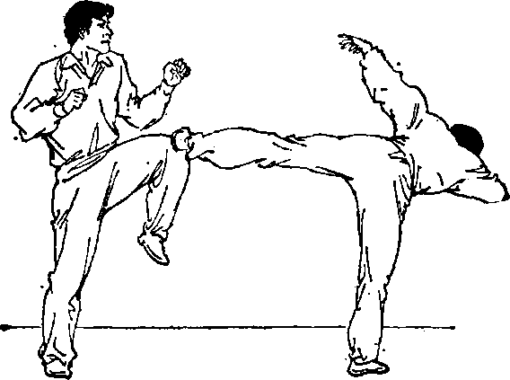 当对方想以脚进攻我中、下盘时我可用脚阻截之。即对方以左脚踹我右胭时在其发力之前我右腿迅速屈