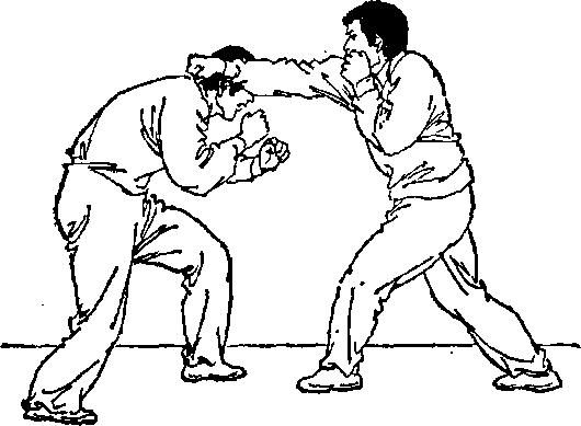 预备式站立当对方以直拳或勾拳进攻时后闪不及便可采用侧闪技术(图一56)。要求侧闪的幅度以能闪开对方的进攻为度。