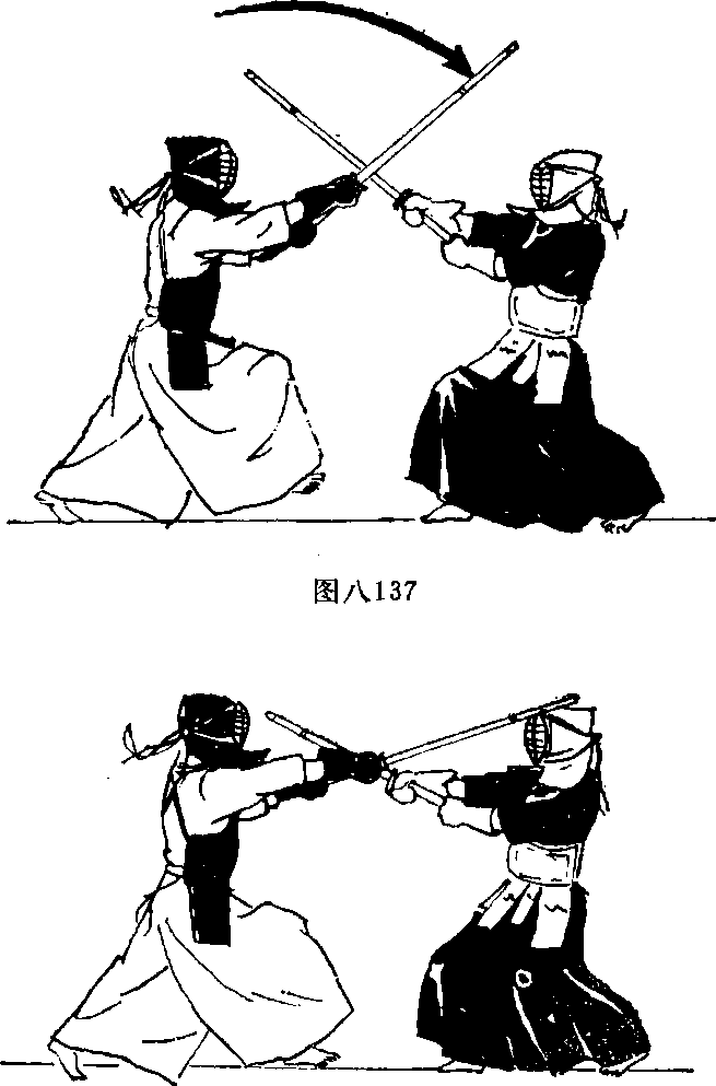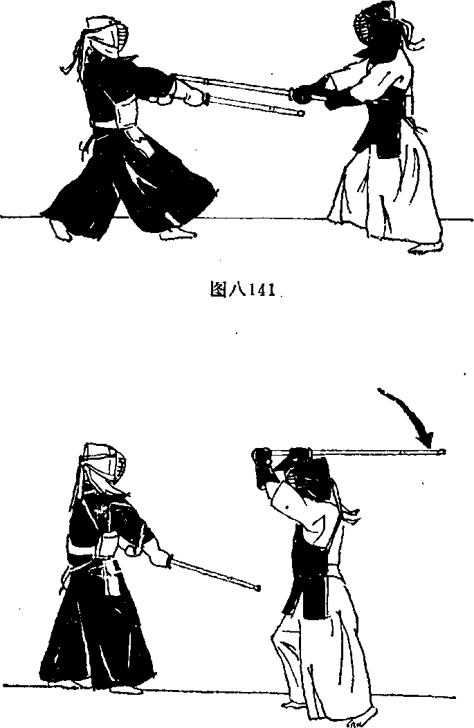 攻方从中段预备式开始看见对方起动迅速上振剑右脚向前跨步用向外、向前的力紧贴着对方剑劈下劈击对方头部(图八136、137、138)2对方劈击右腕部攻方从中段预备式开始左脚向左侧开步同时迅速上振剑沿对手劈击来的剑的上部分向下劈击使其剑下落立即上振剑双手用力下振剑劈击对方头部(图八139、140141142143)。图八139图八143