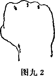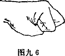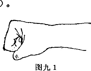 (一)拳拳用于攻击面部、胸部、腹腔太阳丛和腹部。拳的握法四指并拢卷紧拇指压于食指和中指的第二指节处(图九11 拳背拳背指中指和食指的掌指关节处(图九2)当屈肘向上或侧向使用拳背的效果最好。 2 锤拳锤拳指小指到手腕间的肌肉部分(即拳抡。图九3)用锤拳从外向里或从上向下劈击最有效。3 平拳平拳是手指的第二指节弯曲指尖贴紧手掌拇指扣于虎口处(图九4 用第二指节冲击对方的上唇或4 指节拳指节拳是中指或食指从正常的拳中突出(图九5、6运用此拳击打头部的上唇、太阳穴及两肋、腹腔太阳丛效果很好。图九5图九5图九5图九5