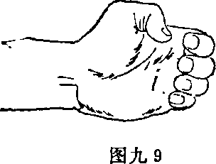 3 掌根掌根指四指并拢屈曲手指贴紧手掌拇指扣于虎口处屈腕后手掌的拇指球和小指球的部分(图九9)掌根主要用于击打面部或下颌。有时也用于防守。