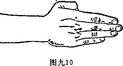 4 插指插指做法与手刀相似但要求中间两指微屈(图九10)。运用时用掌指插击。插指可分纵插、仰插、俯插等几种。