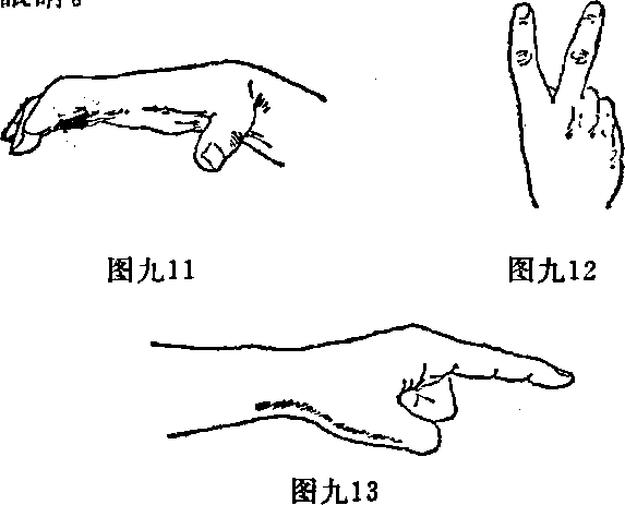 6,剪形指剪形指的做法是——伸展食指与中指两指略微分开拇指压于无名指的第二指节处(图九12)。剪形指主要用于插击两眼。