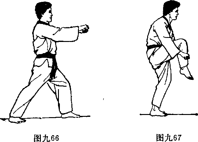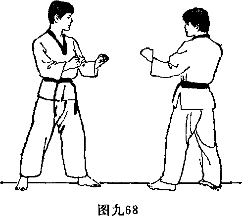 1面对目标两脚前后开立左脚在前两手握拳做好准备姿势(图九68)。