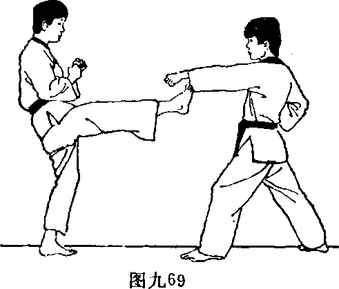 2右腿向前上方踢摆屈踝用足前掌踢击对方冲拳的前臂支持腿微屈(图九69)。