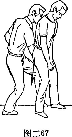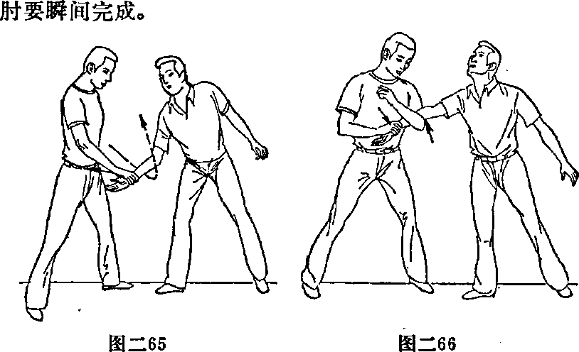 上并拉直其手臂,随即左臂由下向上猛撞其右肘使其反肘受折(图二66)