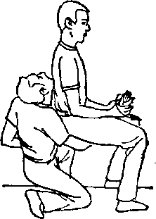 动作当对手从背后用右手掏你裆部时(图二67),你迅速用两手抓握其手掌(两拇指插至其掌心其余四指紧扣其