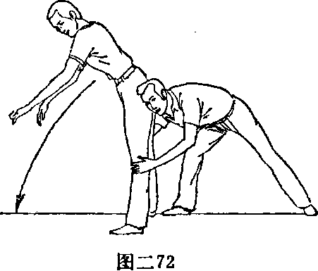 图二70图二70图二71图二7115,被摔趴地(由后)动作1当对手由背后抱住你双腿(图二72),并将你摔趴在地随即上步擒你时你就地迅速翻转身体同时用右腿封抵对手前脚左脚则向斜上横扫其腰、胯部使对手倒地(图二73)。若能击中其裆部则效果更佳。
