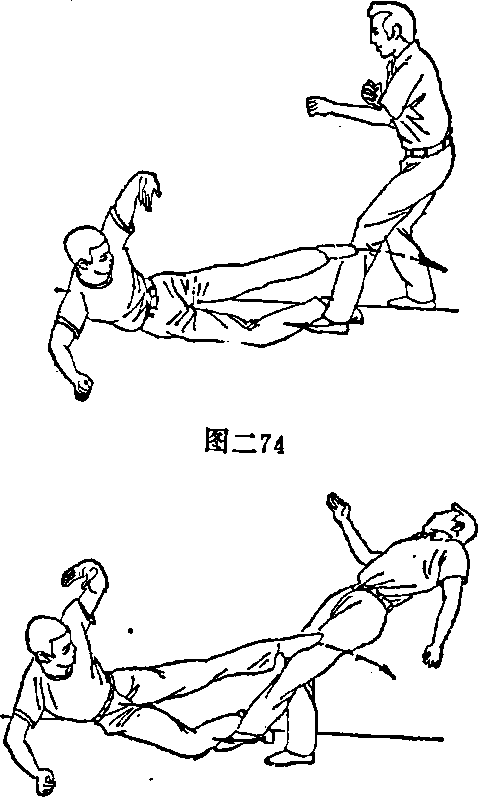 动作2当对手从背后将你摔趴在地并上步擒你时你迅速翻转身体随即用一脚勾拉对手前脚脚跟另一脚则猛力蹬挫对手前腿膝关节(图二74),两脚合力使其膝关节受损倒地(图二75)。