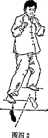 以警戒式向前滑步。先以前脚向前滑动半步后脚随即跟上立即恢复原姿势(图四2)