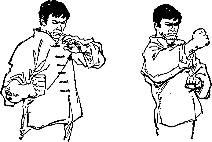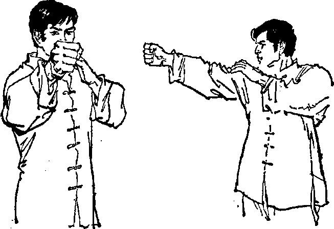 图四10图四10翻背拳是突发性最大的拳法之一。因为它迅速、准确而又灵活多变所以不易被对方察觉。这种打法由警戒式或两手轻松地垂于两懿侧突然地发出。尤其是后一种情况因处于非交战状态因此可打