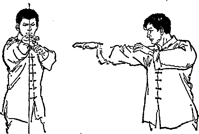 图四13图四13秀拳击手对垒,秀拳击手对垒,(图四11、12)主要戳击对方的眼睛和喉部此手法易伤人。