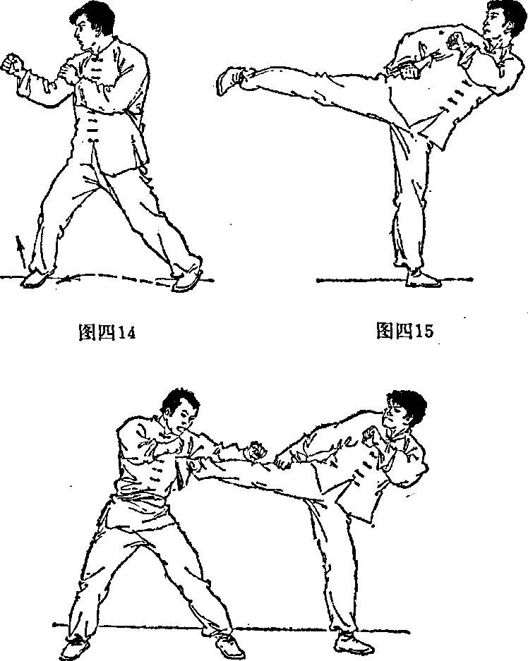 以左手式警戒式站立(图四。重心稍前移左脚向右腿并步并支撑重心随之右腿屈膝提起右肘回收至腰间。上动不停右腿屈膝上抬至腰部高时快速向体侧中部位伸膝出脚脚稍内扣力达脚掌外侧同时左腿(支撑腿)伸直上体侧倾(图四15)。左脚也可做侧步侧踢。当对方以直拳或翻背拳进攻时左脚向左侧稍撤步然后以同