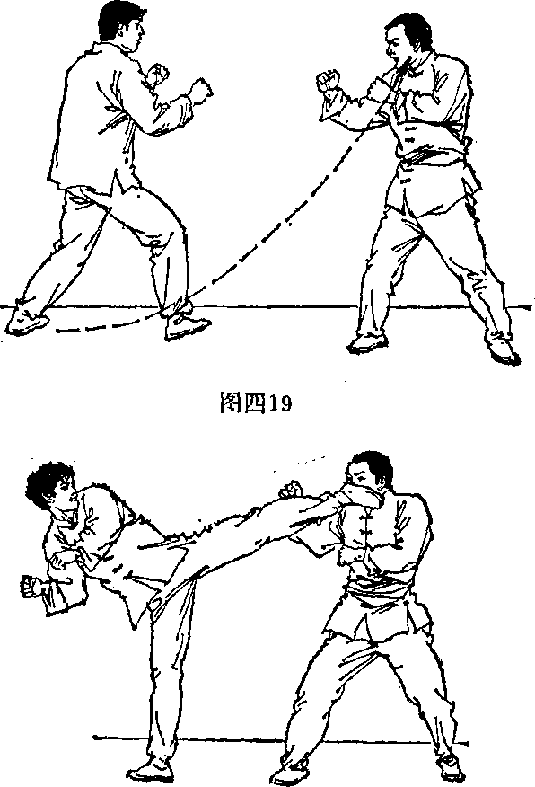 图四215佯踢佯踢即腿的假动作。112 图四22若想以脚进攻对方下盘则先向