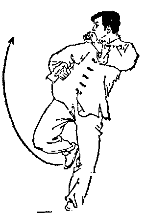 图四215佯踢佯踢即腿的假动作。112 图四22若想以脚进攻对方下盘则先向以左手式警戒式站立左脚向右脚并步并支撑重心右腿屈膝提起(图四21)然后经前侧方向侧后方做半圆形踢击动作力达脚掌两手不动或稍伸展眼随脚视(图四22)。