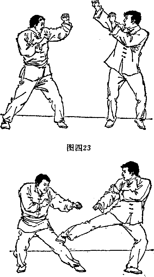 以左手式警戒式站立右者左腿向右腿并步同时身体重心上提两臂上摆给对方造成一个进攻上盘的假象(图四23),把对方的注意力引至上盘然后快速降低身体重心向对方下盘(膝关节处)猛力侧踢力达脚掌外沿两臂自然下摆眼视对方(图四24)。