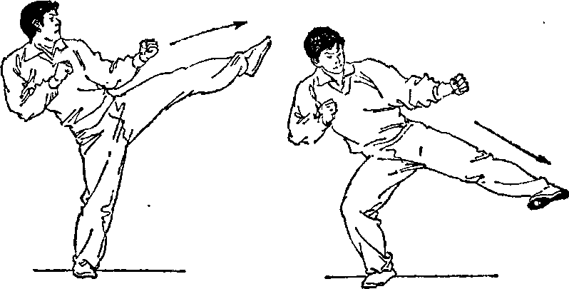 4点腿以左点腿为例预备式站立右腿支撑身体左腿屈膝脚背屈紧然后向前伸腿力达脚尖高与胸齐(图一8)要求3点腿时展髓点腿后快速收小腿。此法多用来攻击对方中盘。