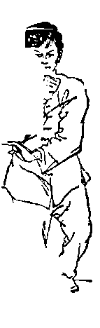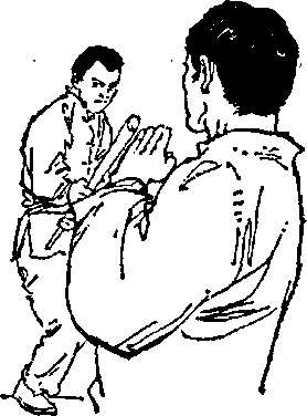 训练时可用一根长棒来练习内侧高位格挡技术。同伴用棒向你面部直刺时你将身体重心后移避开这一刺。同时用左手轻轻挡开木棒(图四25)。对直拳或平勾拳的防守一般以警戒式站立当对手出拳在一手格挡对方攻击的同时另一手便迅速进攻(图四26、27)。