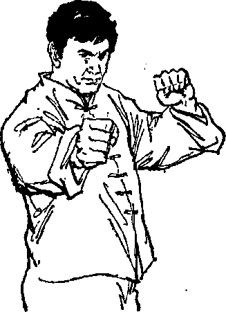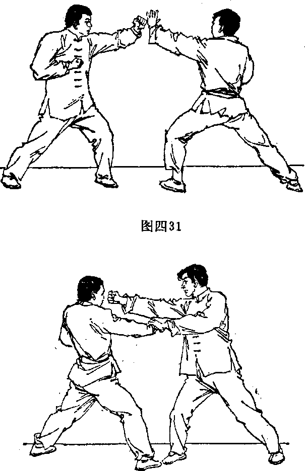 外侧低位格挡法几乎与内侧低位格挡法相同只是后者的手由身体的一侧转到另一侧而防护的手要用来保护身体的这一侧以抗击可能向低位发来的攻击(图四30)。因此外侧低位格挡要比内侧低位格挡有更大的动作幅度就象内侧低位格挡一样其目的在于使来拳向下偏斜。