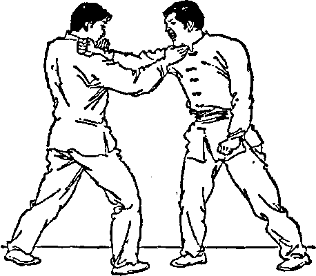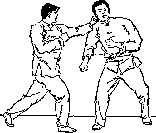 用手指戳击眼睛(图四34)。如同在踢击技法中小腿与膝盖是第一线攻击目标一样眼睛是受攻击的主要目标一旦眼睛被弄伤就难以自卫。由于手指戳击要比拳击多延伸出7?8厘米所以它是攻击和防守的首要方法。