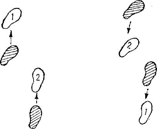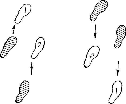 9 右闪步向右闪步时以后脚前掌为轴脚跟向右侧旋转大约45度。身体着后脚旋转突然向左侧转动。同时前脚迅速向左侧后方移动一步(图五19),改变了原来的站立方向。