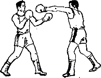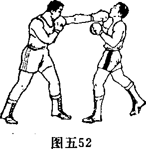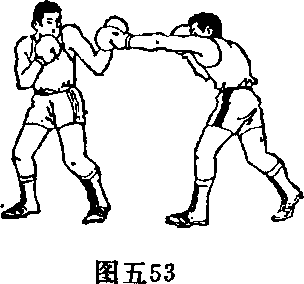 头部先向后闪身在对手击空时立即以左直拳还击其头部(图五51、52)做这个动作时有两种方法一是当对手出拳没有冲力时自己可以在原地将上体先向后仰重心落于后脚的同时上体随即前倾用左直拳还击。另一种是当对手出拳冲力或跨步较大时自己可先向后移步进行摆脱后脚落地后再迅速蹬地出左直拳还击。