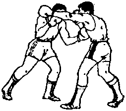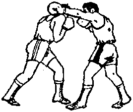 4 向左侧身闪用左上勾拳还击腹部向左侧身闪上体和头部要下潜前倾重心放在前脚上体还须略向左转使对手的左直拳从自己的颈部右侧滑过。随即左脚蹬地向右转体以左上勾拳还击对手的腹部或右肋(图五55、56)