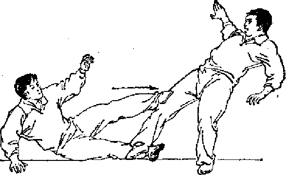 5倒身割谷摔当甲以直、摆、勾连拳进攻时乙迅速后倒身并用一脚勾甲踝关节另一脚踩割甲的膝关节使