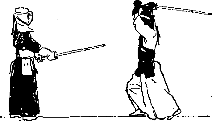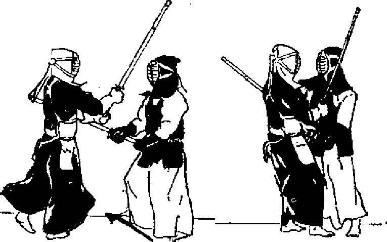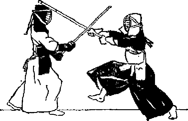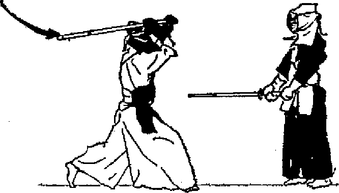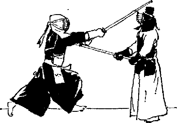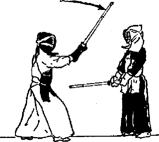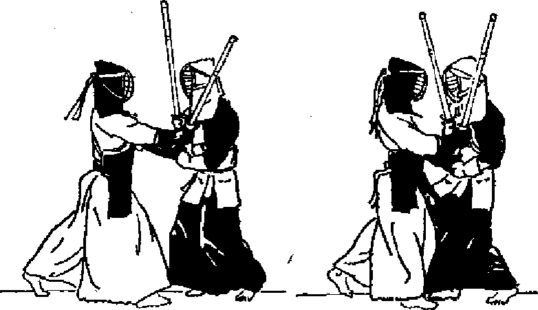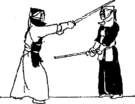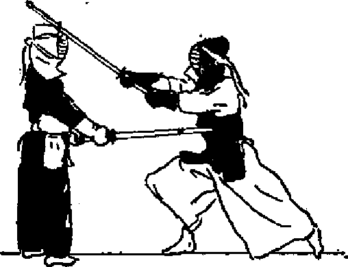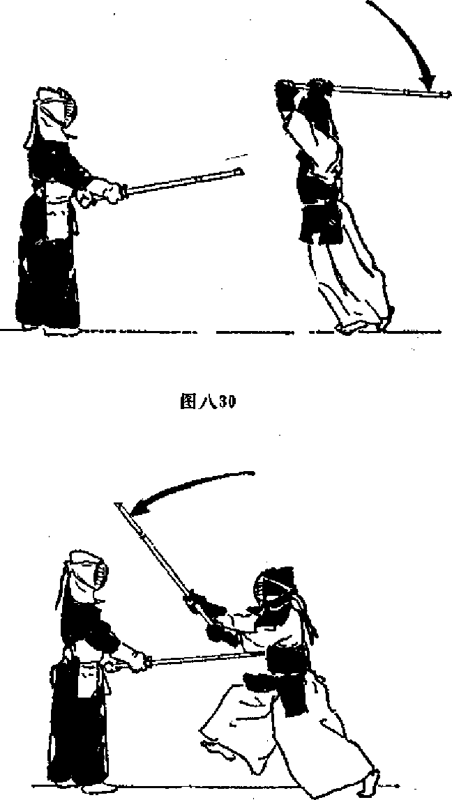 攻者右臂伸向守者头部劈击后两手向腰引拉的瞬间守者右脚向有斜前方滑出进行躲闪然后童心移向右脚用剑从横向压住攻者的剑(图八2八28,29)