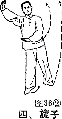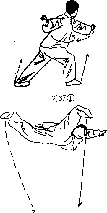 (二)上动未停,重心向 左脚移,右脚向上摆起过腰多 同时,左脚猛力蹬起,上体向 左猛带,腰扭转,做腾空旋子 (图37②)o