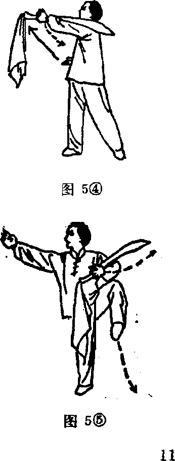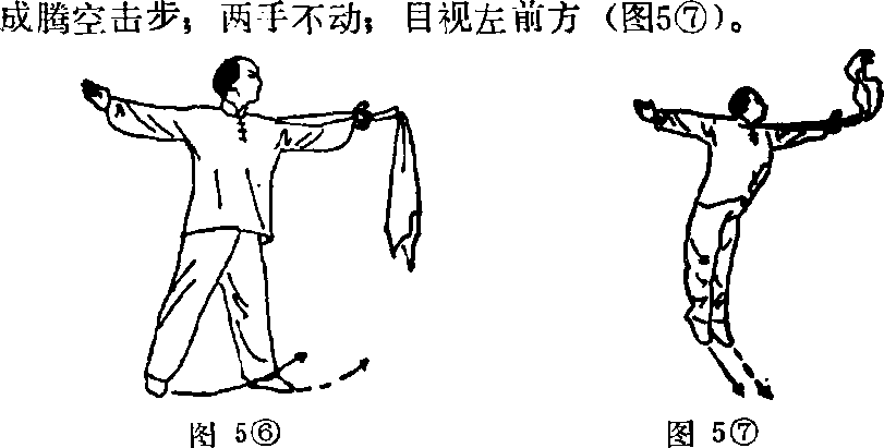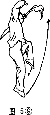 (十)上动未停,身体腾空,右腿向上直摇,高与腰平, 脚面绷平I左腿屈膝脚跟向臀 部靠近,同时,右掌向前下 压,拍击右脚面,击响响亮 (图5⑩)。