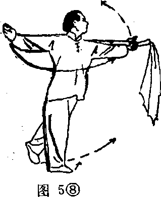 (八)上动未停.左脚向前落步,右脚再向前迈步,两腿 伸直,左脚尖虚点地面;两臂向上平举高与肩平行,目视左 前方(图5⑧)。