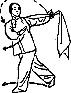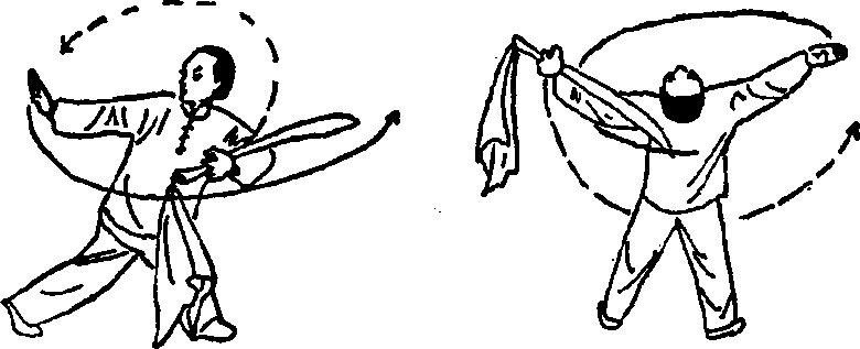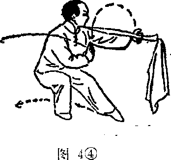 (四)上动未停,右脚向前迈步,重心移向右腿,两膝伸 直分腿站立3同时,左手抱刀,由左经头上、向右摆,高与 肩平,刀刃向上,刀尖朝后,右掌下落,置于右腰侧,掌心 向上,指尖朝前;目视左手(图5④)。