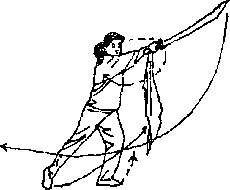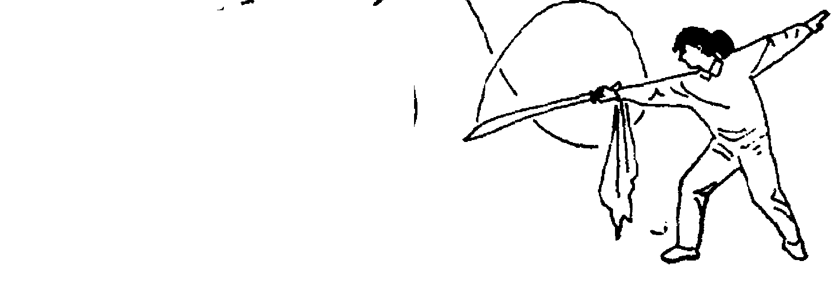3. 图142图142两腿直立,脚尖外撇; 右手持刀臂外旋经上向后、向 下,向斜上方弧形撩出,刀刃 向上,右臂与刀成-直线,左 手臂外旋手心向上举于左斜上 方,挺胸抬头,上体后仰;目 视刀尖(图143)。