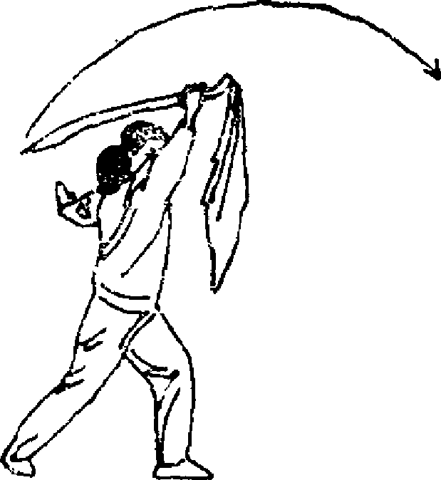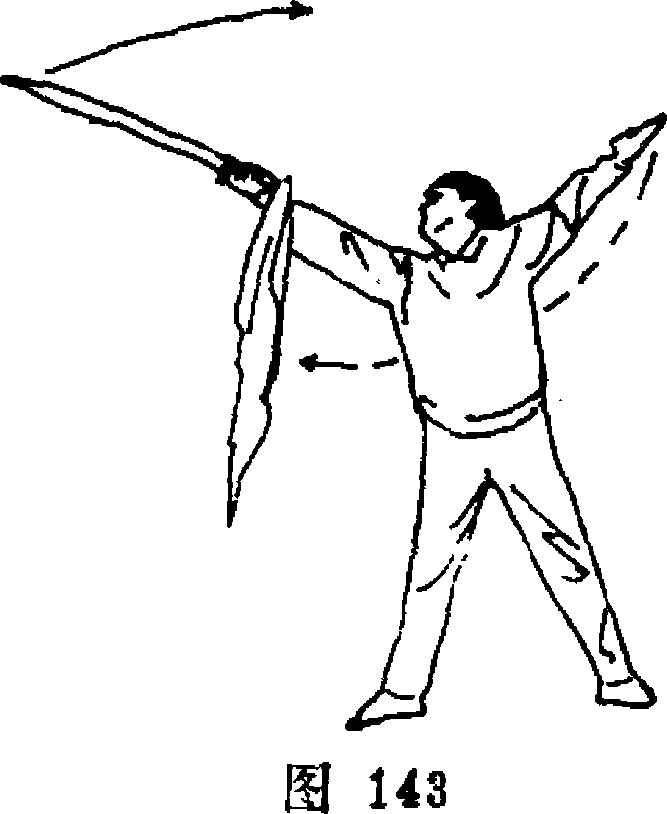 1. 身体左转,两腿微屈;右手持刀随转体向前带至头顶 上方:刀刃向上,左手向右摆至体侧;目视前方(图144)。