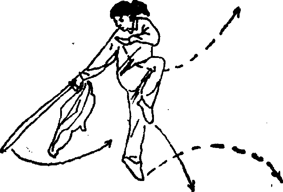 3?重心前移,左腿用力蹬地跳起,右腿屈膝上摆,小 腿里扣,两脚而绷平;右手持刀向下、向后斜下方摆出,左 手经胸前摆至右肩前,两手心向下,上体前俯并向右拧转; 目视刀尖前方(图146)?