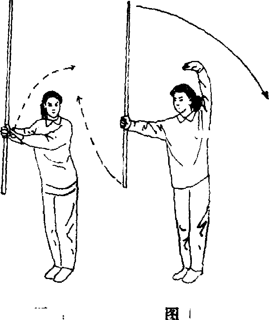 2?左手向左后、向下、向前划弧接握棍身,继而双手 将棍举于头顶上方,两臂微屈;目视前方(图6)0