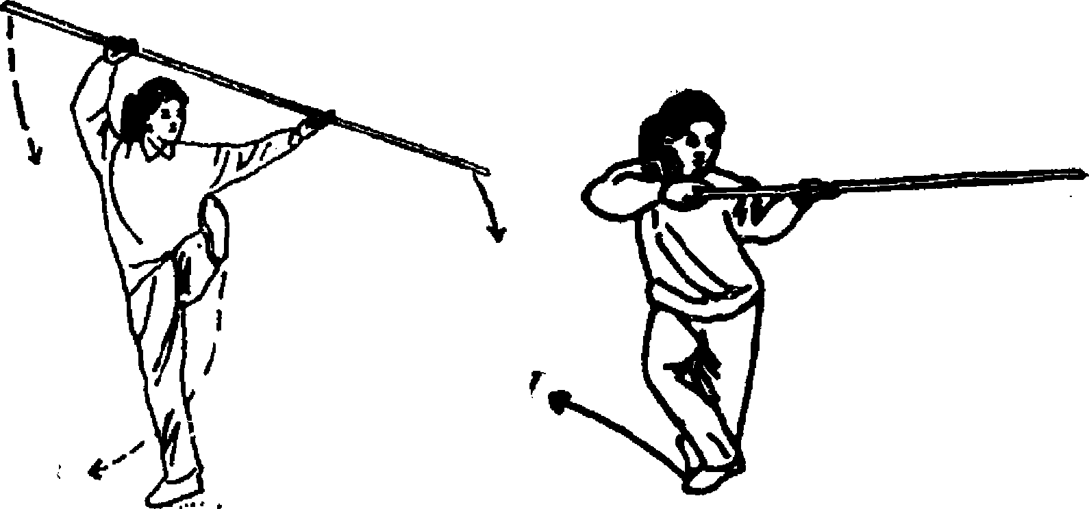 5. 重心后移,右腿屈膝,左脚向右斜后方落步,脚跟. 抬起;右手持棍屈肘落至胸前,棍把收于右腋下,左手向后 滑握,使棍梢向左前平摆;目视前方(图9)°