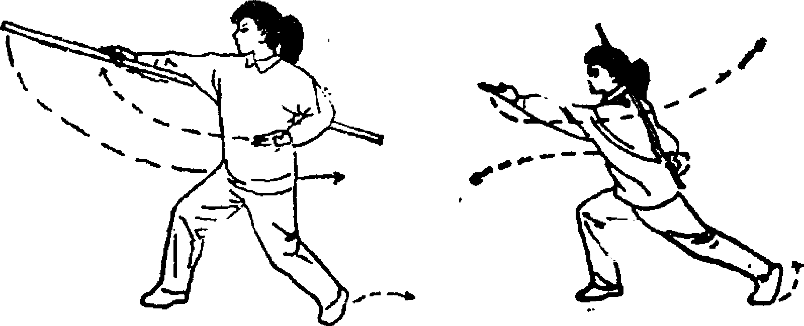 1. 重心上起,右腿微屈膝,左脚向前跟小芈步,脚跟 指起腿微屈;右手持棍向右斜前方摆出,左手屈肘收于腰 侧,掌心向上;目视右前方(图23)。
