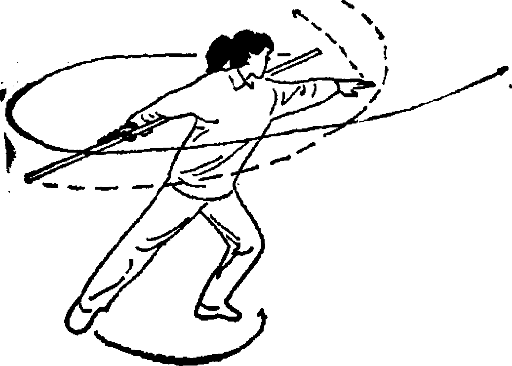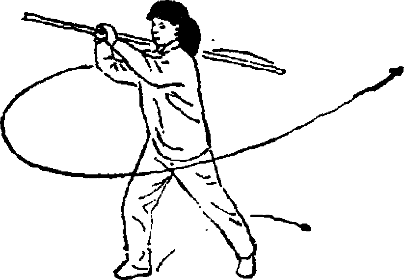 脚眼抬起;右手持棍将棍把向右、向前、向左上方摆出,使 棍稍经后向右、向前划弧云棍,左手随转体与右手交叉接握 棍;目视右斜前方(图26)°